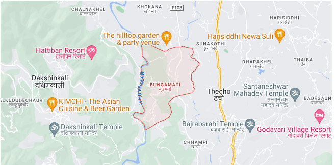 The road leading from Patan to Bungamati, which lies 5 km. south of Patan is dotted with small votive chaityas. The village of over 2,000 people is tightly clustered on a hilly riverside slope, surrounded by terraced rice fields and clumps of trees. Past a Ganesh temple, a series of steps lead to a gate guarded by two lions and the head of a third one, which juts out from a ramp obviously built around the animal. A shikhara-style temple with heavy columns houses the idol of the popular Rain God, Rato Machhendranath. This idol is taken around on a chariot procession through the streets of Patan once every year. Through the grille of the wooden door of the nearby Lokeshwar shrine, you may catch a glimpse of the huge head of Bhairav with a crooked nose.